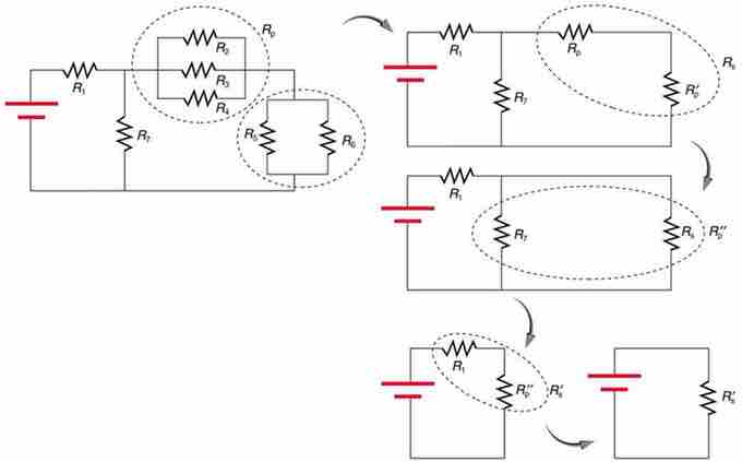 For more complicated combination circuits, various parts can be identified as series or parallel, reduced to their equivalents, and then further reduced until a single resistance is left, as shown in . In this figure, the combination of seven resistors was identified by being either in series or in parallel. In the initial image, the two circled sections show resistors that are in parallel.