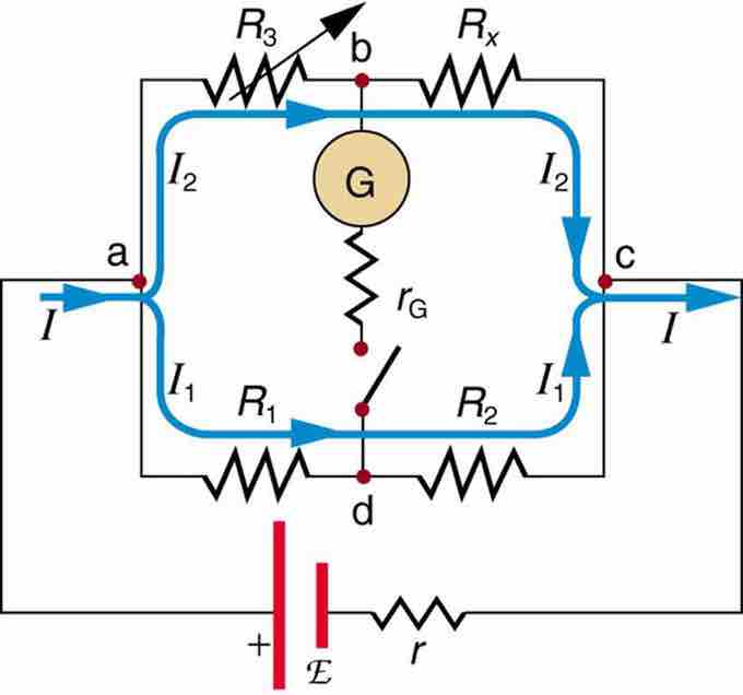The potential difference between points b and d is then zero, meaning that b and d are at the same potential. With no current running through the galvanometer, it has no effect on the rest of the circuit. So the branches abc and adc are in parallel, and each branch has the full voltage of the source. Since b and d are at the same potential, the IR drop along ad must equal the IR drop along ab. Again, since b and d are at the same potential, the IR drop along dc must equal the IR drop along bc. This equation is used to calculate the unknown resistance when current through the galvanometer is zero. This method can be very accurate, but it is limited by two factors. First, it is not possible for the current through the galvanometer to be exactly zero. Second, there are always uncertainties in R1, R2, and R3, which contribute to the uncertainty in Rx.