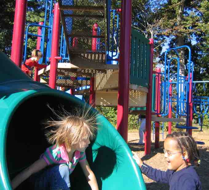 Due to friction between her hair and the plastic slide, the girl on the left has created charge separation, resulting in her hair being attracted to the slide.