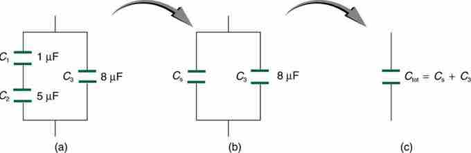It is possible for a circuit to contain capacitors that are both in series and in parallel. To find total capacitance of the circuit, simply break it into segments and solve piecewise .