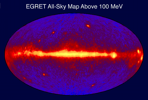 This is an image of the entire sky in 100 MeV or greater gamma rays as seen by the EGRET instrument aboard the CGRO spacecraft. Bright spots within the galactic plane are pulsars (spinning neutron stars with strong magnetic fields), while those above and below the plane are thought to be quasars (galaxies with supermassive black holes actively accreting matter).
