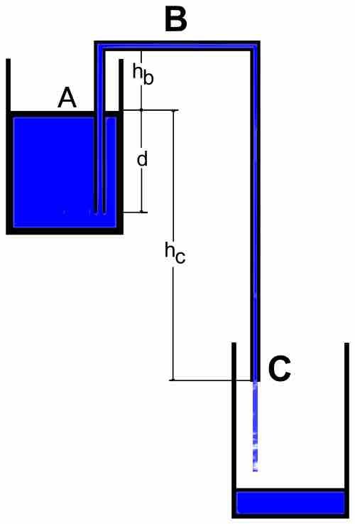 Syphoning fluid between two reservoirs. The flow rate out can be determined by drawing a streamline from point ( A ) to point ( C ).