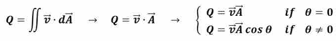 Moreover, only the flow velocity component parallel to the surface normal of the surface in question, or alternatively the flow velocity component perpendicular to the surface in question contributes to the volumetric flow rate. Figure 1 and Equation 2 illustrate decomposition of the flow velocity vector, making an angle θ with respect to the normal of the surface plane in order to calculate volumetric flow rate through that surface. Thus, volumetric flow rate for a given fluid velocity and cross-sectional surface area increases as θ decreases, and is maximized when θ = 0. Volumetric flow rate is an important scalar quantity in fluid dynamics and is used widely in fluid flow measurements. Volumetric flow rate can be converted to mass flow rate if the density of the fluid is known. Flow of fluids through a closed system is often analyzed as a hydraulic circuit analogous to electron flow in an electronic circuit where: 1) the volumetric fluid flow is analogous to the electric current, 2) pressure is analogous to the voltage, and 3) fluid velocity is analogous to current density.