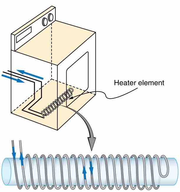 The heating coils of an electric clothes dryer can be counter-wound so that their magnetic fields cancel one another, greatly reducing the mutual inductance with the case of the dryer.