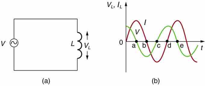 (a) An AC voltage source in series with an inductor having negligible resistance. (b) Graph of current and voltage across the inductor as functions of time.