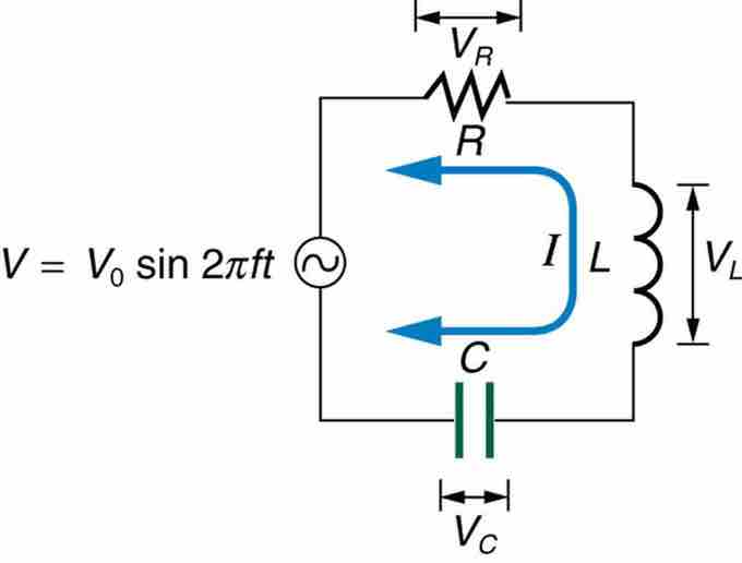 An RLC series circuit with an AC voltage source. f is the frequency of the source.