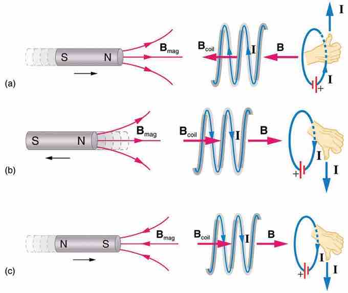 (a) When this bar magnet is thrust into the coil, the strength of the magnetic field increases in the coil. The current induced in the coil creates another field, in the opposite direction of the bar magnet's to oppose the increase. This is one aspect of Lenz's law—induction opposes any change in flux. (b) and (c) are two other situations. Verify for yourself that the direction of the induced Bcoil shown indeed opposes the change in flux and that the current direction shown is consistent with the right hand rule.