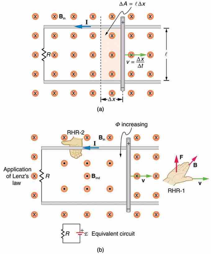 Consider the situation shown in . A rod is moved at a speed v along a pair of conducting rails separated by a distance ℓ in a uniform magnetic field B. The rails are stationary relative to B, and are connected to a stationary resistor R (the resistor could be anything from a light bulb to a voltmeter). Consider the area enclosed by the moving rod, rails and resistor. B is perpendicular to this area, and the area is increasing as the rod moves. Thus the magnetic flux enclosed by the rails, rod and resistor is increasing. When flux changes, an EMF is induced according to Faraday's law of induction.