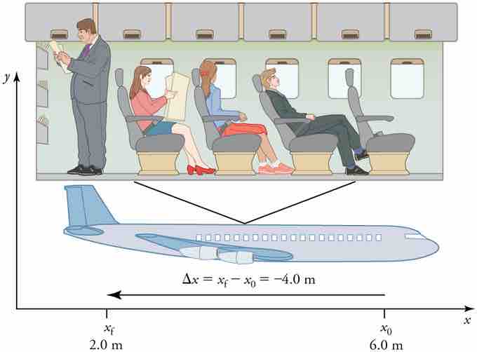 A passenger moves from his seat to the back of the plane. His location relative to the airplane is given by x. The -4.0m displacement of the passenger relative to the plane is represented by an arrow toward the rear of the plane. Notice that the arrow representing his displacement is twice as long as the arrow representing the displacement of the professor (he moves twice as far).