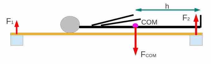 where M is mass of the subject. (We assume that the wooden beam has no mass. ) This equation doesn't provide all the information to locate the COM. However, the equation of motion for torque