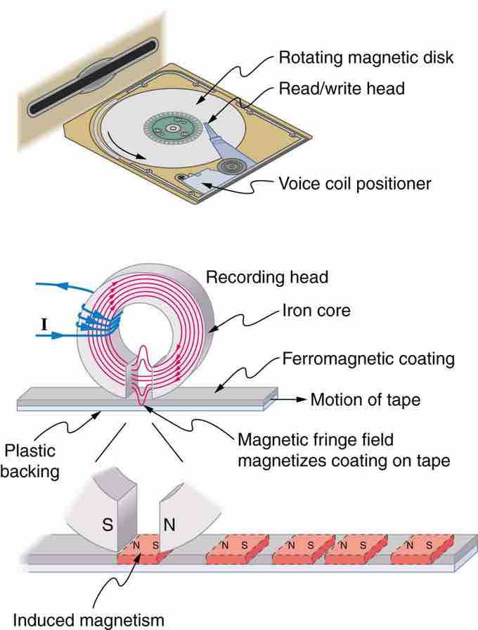 An electromagnet induces regions of permanent magnetism on a floppy disk coated with a ferromagnetic material. The information stored here is digital (a region is either magnetic or not); in other applications, it can be analog (with a varying strength), such as on audiotapes.