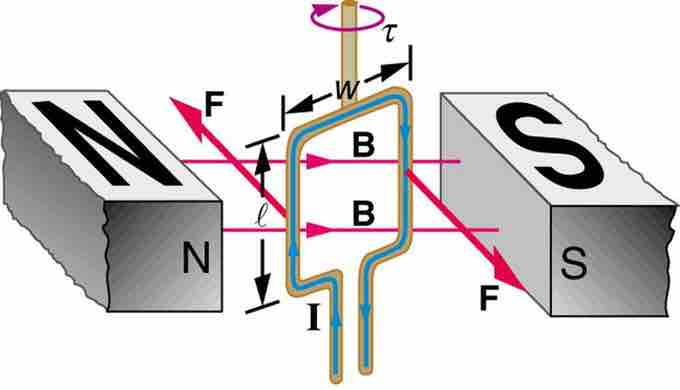 In this model, the north and south poles of magnets are denoted by N and S, respectively. In the center is a rectangular wire loop of length l and width w, carrying current I. The effect of magnetic field B on the current-carrying wire exerts torque τ.