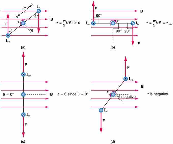 Maximum torque occurs in (b), when is 90 degrees. Minimum torque is 0, and occurs in (c) when θ is 0 degrees. When loop rotates past =0, the torque reverses (d).