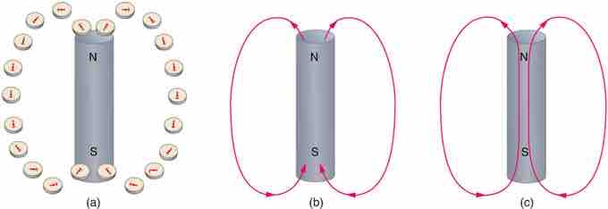 Magnetic field lines are defined to have the direction that a small compass points when placed at a location. (A) If small compasses are used to map the magnetic field around a bar magnet, they will point in the directions shown: away from the north pole of the magnet, toward the south pole of the magnet (recall that Earth's north magnetic pole is really a south pole in terms of definitions of poles on a bar magnet. ) (B) Connecting the arrows gives continuous magnetic field lines. The strength of the field is proportional to the closeness (or density) of the lines. (C) If the interior of the magnet could be probed, the field lines would be found to form continuous closed loops.