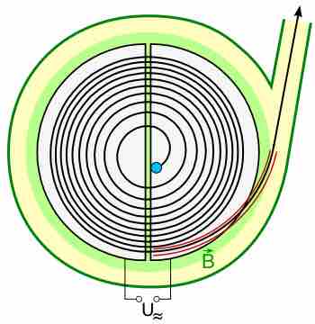 Cyclotrons accelerate charged particle beams using a high frequency alternating voltage which is applied between two "D"-shaped electrodes (also called "dees"). An additional static magnetic field is applied in perpendicular direction to the electrode plane, enabling particles to re-encounter the accelerating voltage many times at the same phase. To achieve this, the voltage frequency must match the particle's cyclotron resonance frequency,