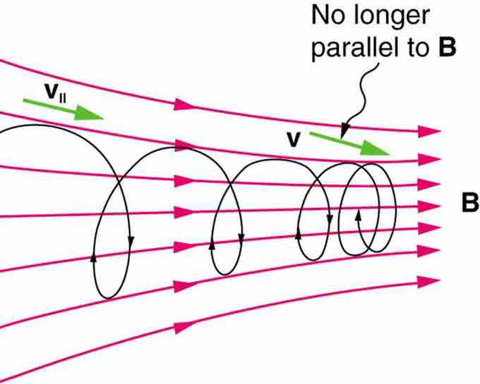 shows how electrons not moving perpendicular to magnetic field lines follow the field lines. The component of velocity parallel to the lines is unaffected, and so the charges spiral along the field lines. If field strength increases in the direction of motion, the field will exert a force to slow the charges (and even reverse their direction), forming a kind of magnetic mirror.