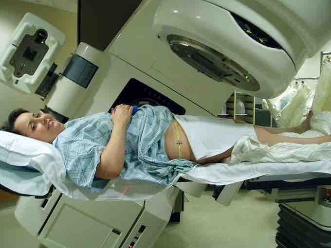 Radiation therapy of the pelvis. Lasers and a mold under the legs are used for precise positioning