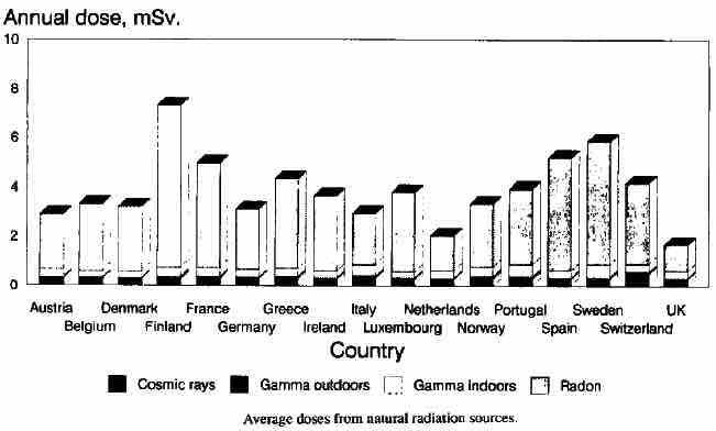 Bar chart of average annual dosages from natural radiation sources for major European countries