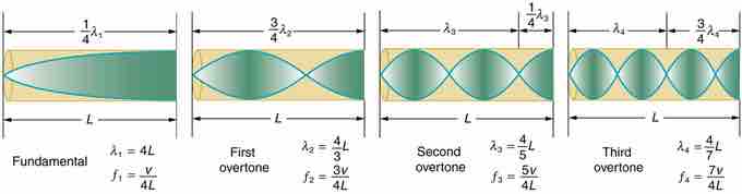 The fundamental and three lowest overtones for a tube closed at one end. All have maximum air displacements at the open end and none at the closed end.