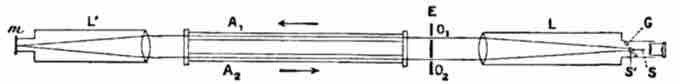 A light ray emanating from the source S' is reflected by a beam splitter G and is collimated into a parallel beam by lens L. After passing the slits O1 and O2, two rays of light travel through the tubes A1 and A2, through which water is streaming back and forth as shown by the arrows. The rays reflect off a mirror m at the focus of lens L', so that one ray always propagates in the same direction as the water stream, and the other ray opposite to the direction of the water stream. After passing back and forth through the tubes, both rays unite at S, where they produce interference fringes that can be visualized through the illustrated eyepiece. The interference pattern can be analyzed to determine the speed of light traveling along each leg of the tube.