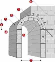A masonry arch1. Keystone 2. Voussoir 3. Extrados 4. Impost 5. Intrados 6. Rise 7. Clear span 8. Abutment