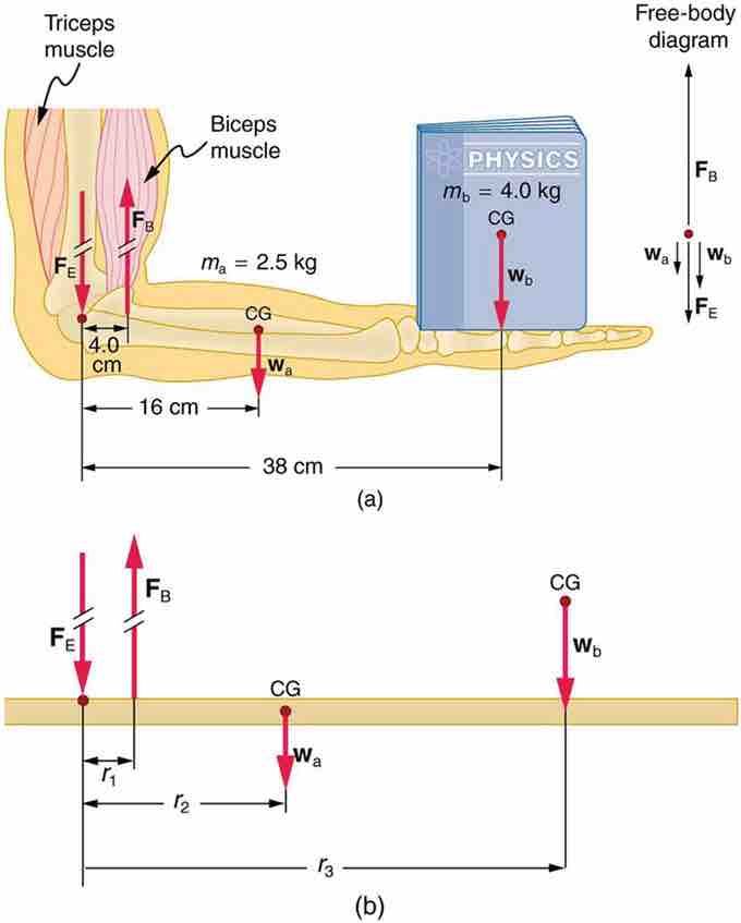 (a. ) The biceps exert a force FB to support the weight of the forearm and the book. The triceps are assumed to be relaxed. (b.) An approximately equivalent mechanical system with the pivot at the elbow joint