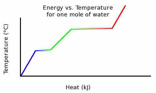 Temperature increases linearly with heat, until the melting point . But the heat added does not change the temperature; that heat energy is instead used to break intermolecular bonds and convert ice into water. At this point, there is a mixture of both ice and water. Once all ice has been melted, the temperature again rises linearly with heat added. At the boiling point, temperature no longer rises with heat added because the energy is once again being used to break intermolecular bonds. Once all water has been boiled to steam, the temperature will continue to rise linearly as heat is added.