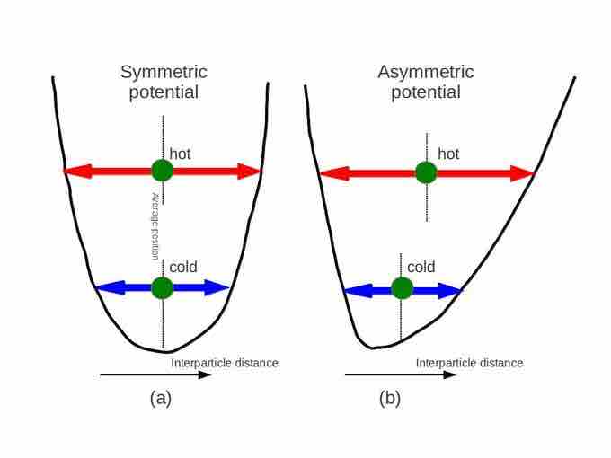 Why does matter usually expand when heated? The answer can be found in the shape of the typical particle-particle potential in matter. Particles in solids and liquids constantly feel the presence of other neighboring particles. This interaction can be represented mathematically as a potential curve. Fig 2 illustrates how this inter-particle potential usually takes an asymmetric form rather than a symmetric form, as a function of particle-particle distance. Note that the potential curve is steeper for shorter distance. In the diagram, (b) shows that as the substance is heated, the equilibrium (or average) particle-particle distance increases. Materials which contract or maintain their shape with increasing temperature are rare. This effect is limited in size, and only occurs within limited temperature ranges.