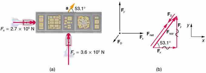 (a) A view from above of two tugboats pushing on a barge. (b) The free-body diagram for the ship contains only forces acting in the plane of the water. It omits the two vertical forces—the weight of the barge and the buoyant force of the water supporting it cancel and are not shown. Since the applied forces are perpendicular, the