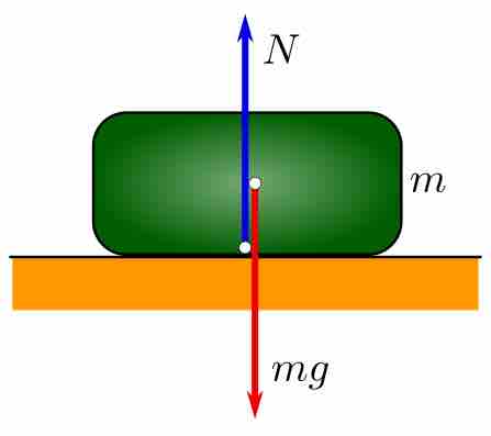A force diagram showing the forces acting on an object at rest on a surface. Notice that the amount of force that the table is pushing upward on the object (the N vector) is equal to the downward force of the object's weight (shown here as mg, as weight is equal to the object's mass multiplied by the acceleration due to gravity): because these forces are equal, the object is in a state of equilibrium (all the forces acting on it balance to zero).