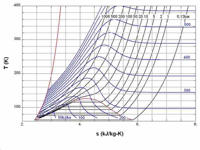 Temperature–entropy diagram of nitrogen. The red curve at the left is the melting curve. Absolute value of entropy can be determined shown here, thanks to the third law of thermodynamics.