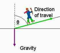 Here is a man walking up a hill. His direction of travel is defined by the angle theta relative to the vertical axis and by the length of the arrow going up the hill. He is also being accelerated downward by gravity.