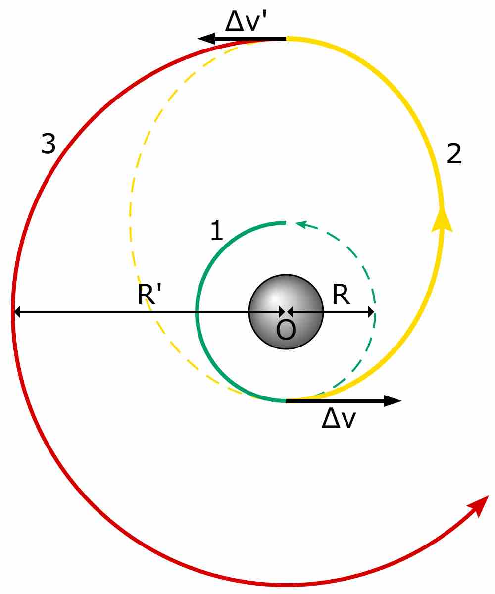 The Hohmann transfer orbit is an elliptical orbit used to transfer between two circular orbits of different altitudes in the same plane. The orbital maneuver to perform the Hohmann transfer uses two engine impulses that move aspacecraft onto and off the transfer orbit, as diagramed in . Hohmann transfer orbits are the most efficient with fuel. Other non-Hohmann types of transfer orbits that are less efficient with fuel exist, but these may be more efficient with other resources (such as time).