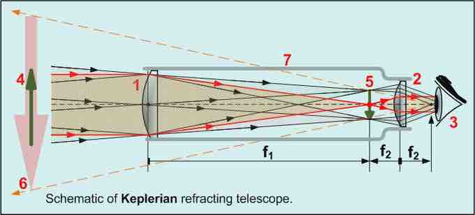 The figure above is a diagram of a refracting telescope. The objective lens (at point 1) and the eyepiece (point 2) gather more light than a human eye can collect by itself. The image is focused at point 5, and the observer is shown a brighter, magnified virtual image at point 6. The objective lens refracts, or bends, light. This causes the parallel rays to converge at a focal point, and those that are not parallel converge on a focal plane.