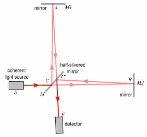 This diagram of a Michelson Interferometer shows the path that the light waves travels in the instrument.