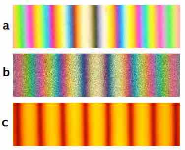 Colored and monochromatic fringes in a Michelson interferometer: (a) White light fringes where the two beams differ in the number of phase inversions; (b) White light fringes where the two beams have experienced the same number of phase inversions; and (c) Fringe pattern using monochromatic light (sodium D lines).