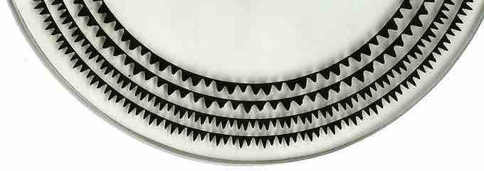 In this early version of an optical disc, you can see the pits and lands which either reflect back light or scatter it.