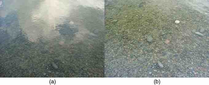 These two photographs of a river show the effect of a polarizing filter in reducing glare in light reflected from the surface of water. Part (b) of this figure was taken with a polarizing filter and part (a) was not. As a result, the reflection of clouds and sky observed in part (a) is not observed in part (b). Polarizing sunglasses are particularly useful on snow and water. (credit: Amithshs, Wikimedia Commons)