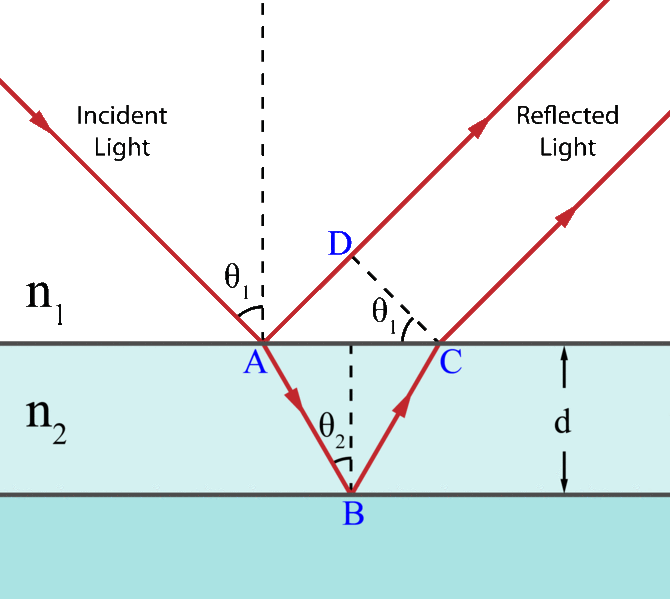 shows a diagram of how thin film interference works. As light strikes the surface of a film it is either transmitted or reflected at the upper surface. Light that is transmitted reaches the bottom surface and may once again be transmitted or reflected. The light reflected from the upper and lower surfaces will interfere. The degree of constructive or destructive interference between the two light waves is dependent upon the difference in their phase. This difference is dependent upon the thickness of the film layer, the refractive index of the film, and the angle of incidence of the original wave on the film. Additionally, a phase shift of 180° or
