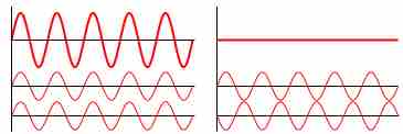 Interference is a phenomenon in which two waves superimpose to form a resultant wave of greater or lesser amplitude. Its effects can be observed in all types of waves (for example, light, acoustic waves and water waves). Interference usually refers to the interaction of waves that are correlated (coherent) with each other because they originate from the same source, or they have the same or nearly the same frequency. When two or more waves are incident on the same point, the total displacement at that point is equal to the vector sum of the displacements of the individual waves. If a crest of one wave meets a crest of another wave of the same frequency at the same point, then the magnitude of the displacement is the sum of the individual magnitudes. This is constructive interference and occurs when the phase difference between the waves is a multiple of 2π. Destructive interference occurs when the crest of one wave meets a trough of another wave. In this case, the magnitude of the displacements is equal to the difference in the individual magnitudes, and occurs when this difference is an odd multiple of π. Examples of constructive and destructive interference are shown in . If the difference between the phases is intermediate between these two extremes, then the magnitude of the displacement of the summed waves lies between the minimum and maximum values.