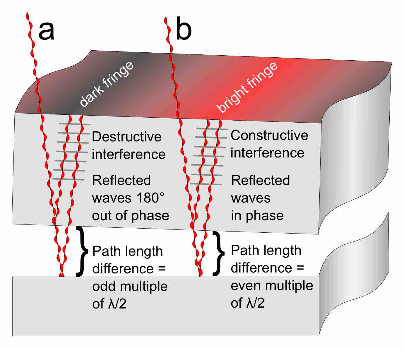 If the path length difference between the two reflected light beams is an odd multiple of the wavelength divided by two, λ/2, the reflected waves will be 180 degrees out of phase and destructively interfere, causing a dark fringe. If the path-length difference is an even multiple of λ/2, the reflected waves will be in phase with one another. The constructive interference of the two reflected waves creates a bright fringe.