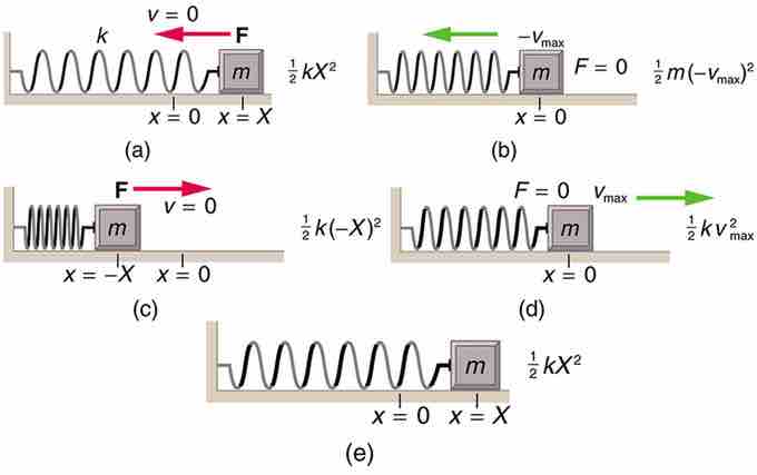 The transformation of energy in simple harmonic motion is illustrated for an object attached to a spring on a frictionless surface. (a) The mass has achieved maximum displacement from equilibrium. All energy is potential energy. (b) As the mass passes through the equilibrium point with maximum speed all energy in the system is in kinetic energy. (c) Once again, all energy is in the potential form, stored in the compression of the spring (in the first panel the energy was stored in the extension of the spring). (d) Passing through equilibrium again all energy is kinetic. (e) The mass has completed an entire cycle.
