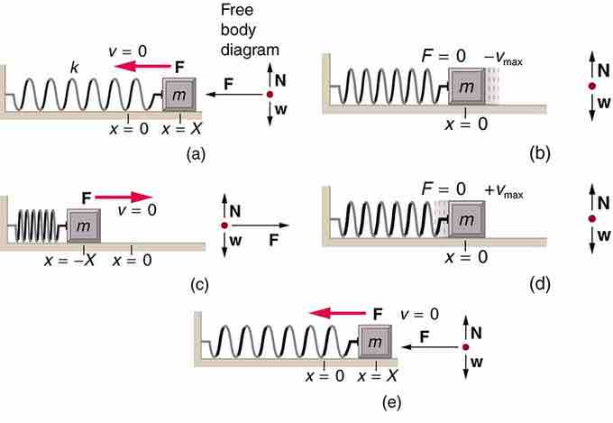 An object attached to a spring sliding on a frictionless surface is an uncomplicated simple harmonic oscillator. When displaced from equilibrium, the object performs simple harmonic motion that has an amplitude X and a period T. The object's maximum speed occurs as it passes through equilibrium. The stiffer the spring is, the smaller the period T. The greater the mass of the object is, the greater the period T. (a) The mass has achieved its greatest displacement X to the right and now the restoring force to the left is at its maximum magnitude. (b) The restoring force has moved the mass back to its equilibrium point and is now equal to zero, but the leftward velocity is at its maximum. (c) The mass's momentum has carried it to its maximum displacement to the right. The restoring force is now to the right, equal in magnitude and opposite in direction compared to (a). (d) The equilibrium point is reach again, this time with momentum to the right. (e) The cycle repeats.