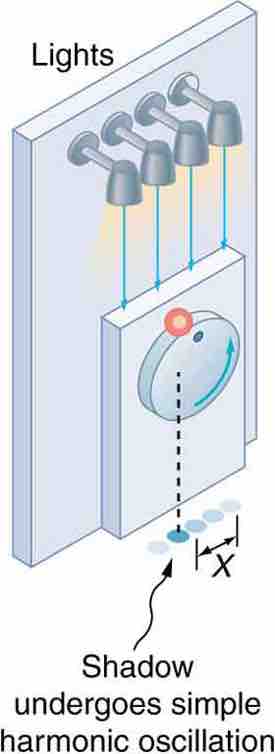 There is an easy way to produce simple harmonic motion by using uniform circular motion. The figure below demonstrates one way of using this method. A ball is attached to a uniformly rotating vertical turntable, and its shadow is projected onto the floor as shown. The shadow undergoes simple harmonic motion .