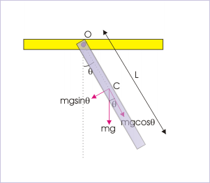 In case we know the moment of inertia of the rigid body, we can evaluate the above expression of the period for the physical pendulum. For illustration, let us consider a uniform rigid rod, pivoted from a frame as shown (see ). Clearly, the center of mass is at a distance L/2 from the point of suspension: