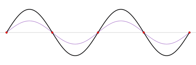 A standing wave (black) depicted as the sum of two propagating waves traveling in opposite directions (red and blue).