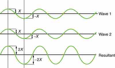 If two identical waves that arrive exactly out of phase—that is, precisely aligned crest to trough—they may produce pure destructive interference. Because the disturbances are in the opposite direction for this superposition, the resulting amplitude may be zero for destructive interference, and the waves completely cancel.