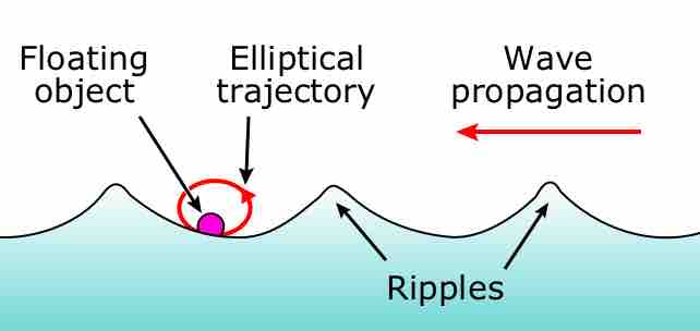 In the case of monochromatic linear plane waves in deep water, particles near the surface move in circular paths, creating a combination of longitudinal (back and forth) and transverse (up and down) wave motions. When waves propagate in shallow water (where the depth is less than half the wavelength), the particle trajectories are compressed into ellipses. As the wave amplitude (height) increases, the particle paths no longer form closed orbits; rather, after the passage of each crest, particles are displaced slightly from their previous positions, a phenomenon known as Stokes drift.