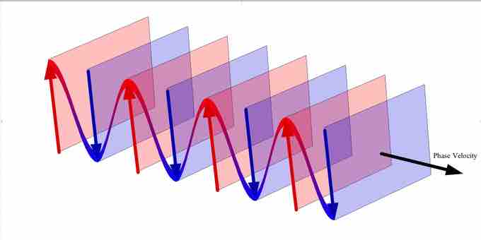 We see a wave propagating in the direction of the phase velocity. The wave can be thought to be made up of planes orthogonal to the direction of the phase velocity.