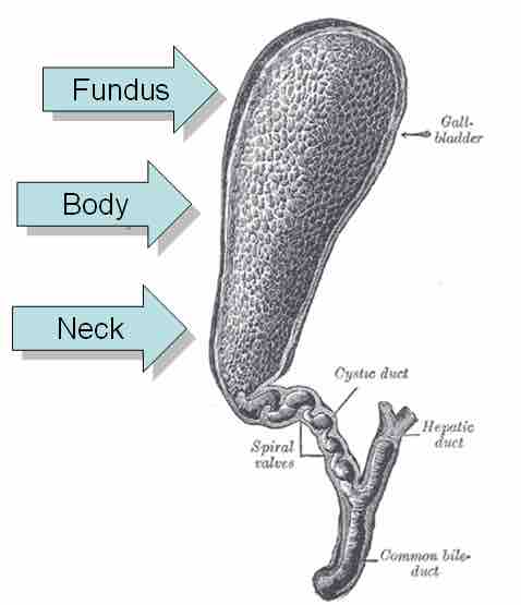 An illustration of the gallbladder from Gray's Anatomy with each section labeled.